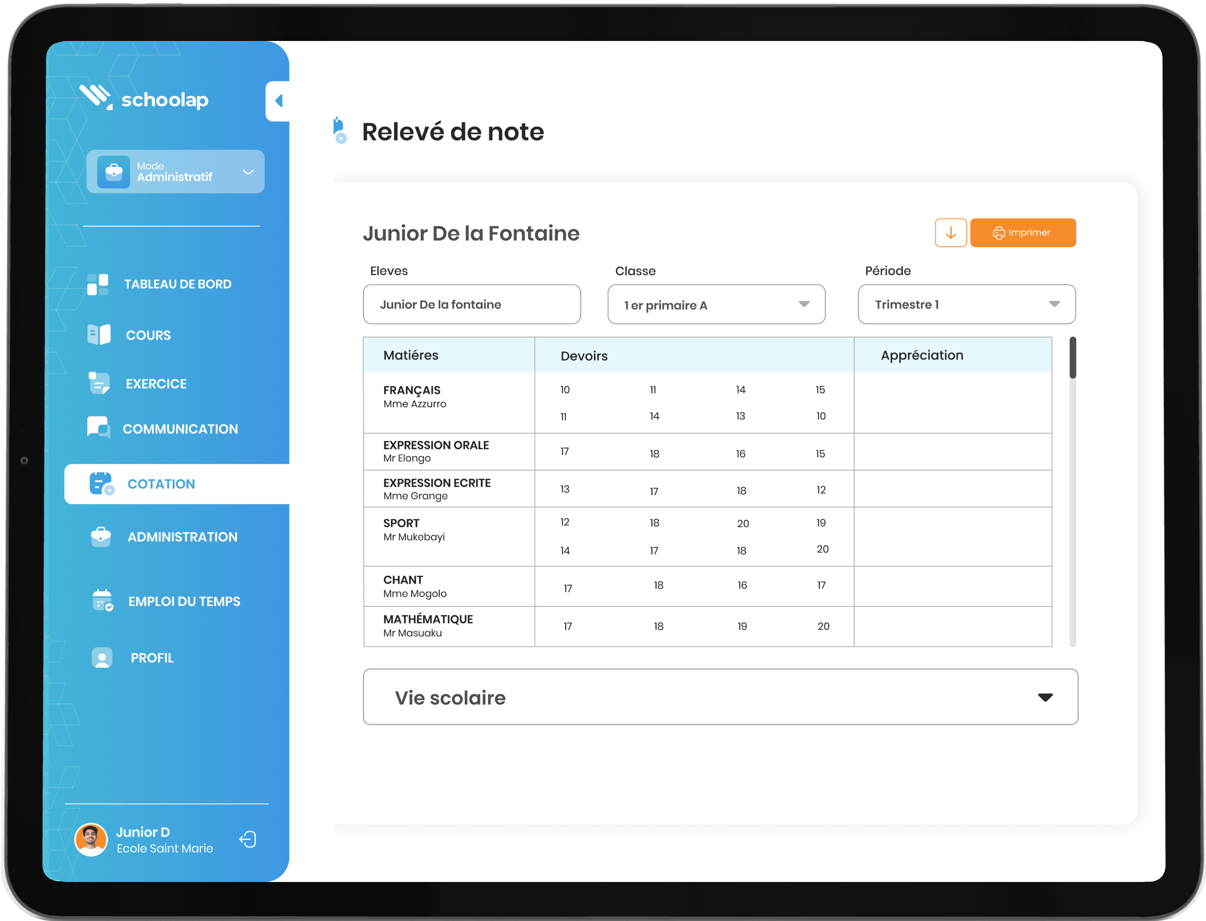 Schoolap permet aux élèves de suivre leur propre progression académique, y compris leurs notes et leurs résultats, favorisant ainsi une meilleure prise de conscience de leurs performances.