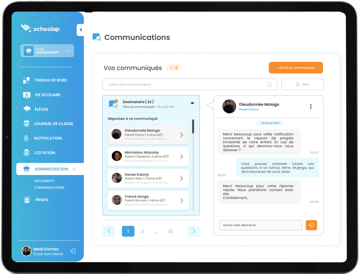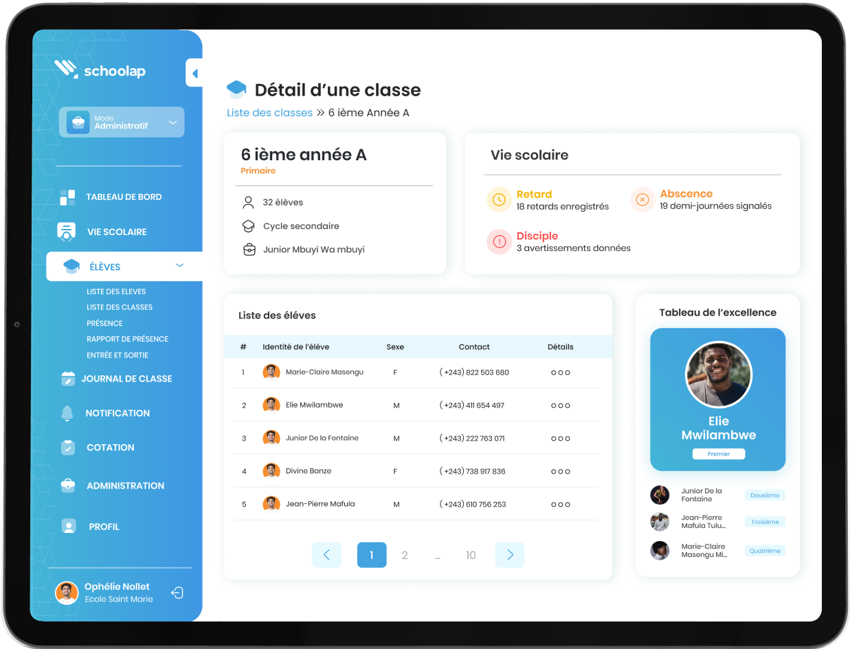 Schoolap permet d’obtenir une vue d'ensemble de l'établissement, y compris les finances, les présences, et les performances des élèves, pour une prise de décision éclairée.